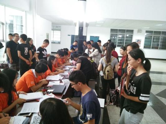 上午10时左右,公司迎来了新生报道的高峰期。各班助班在繁忙中仔细指引新生按照步骤完成报到手续,志愿者们带领新生缴费、领取校园卡、安排住宿。