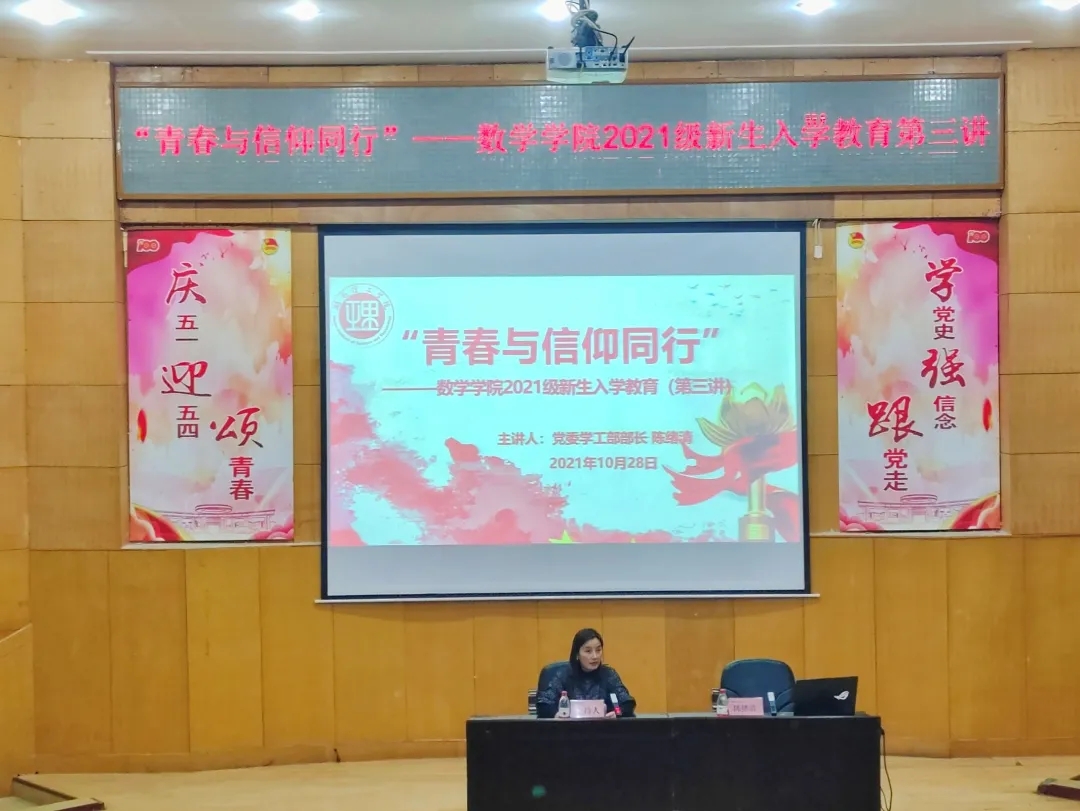 本站讯 为坚定21级新生理想信念,10月28日,“青春与信仰同行”—2021级新生入学教育第三讲于综合楼学术报告厅举行。本次活动由党委学工部部长陈绪清主讲,vsport经理周小强、党委副书记齐亮菲和各年级辅导员出席,21级全体新生参加。